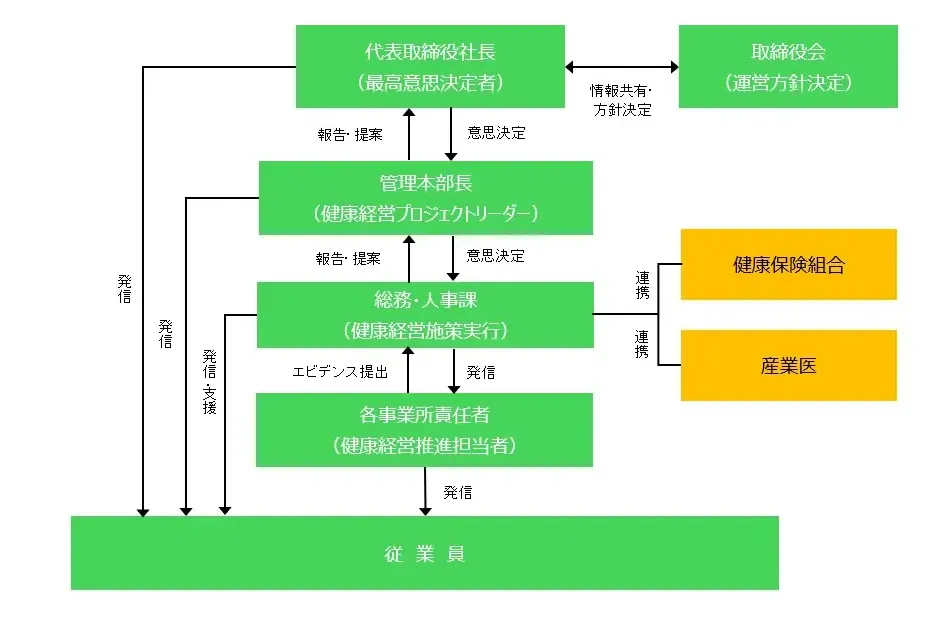 代表取締役社長を健康経営責任者とする健康経営組織体制を構築し、総務・人事課と健康保険組合・産業医が連携を図りながら、健康経営に関する方針・計画の策定や施策の検討を行い、従業員の健康保持増進を推進しています。